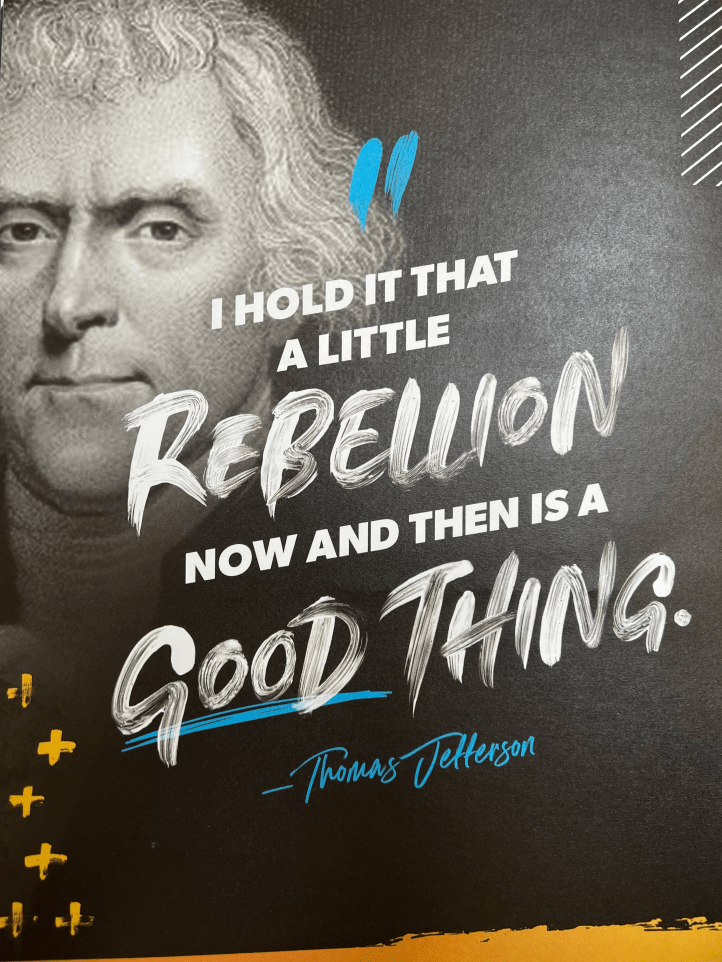 When we take the time to reflect on significant historical figures, you see a thread of rebellion in many unexpected places. Consider this quote that was referenced at the conference from Thomas Jefferson in the picture below:
